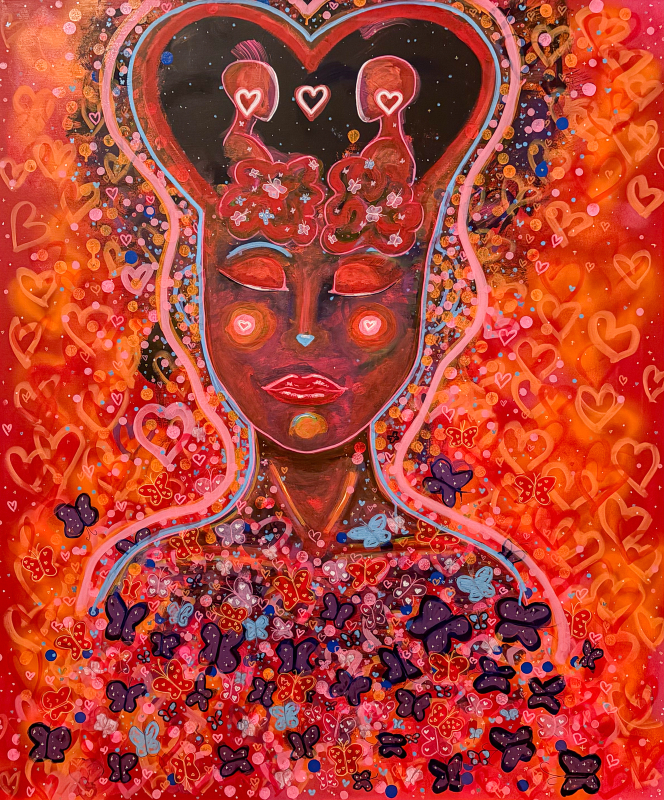 Die Entität Liebe wird hier durch eine universelle menschliche Gestalt verkörpert, die mit geschlossenen Augen träumt. Das Gehirn repräsentiert die Psyche und die Gedankenwelt, die von zwei verliebten Personen bewohnt wird. Wie ein schöner Traum, der sich bis in die Unendlichkeit streckt und die zwei Verliebten in einer Galaxie schweben lässt. Die Liebe füllt jede Ecke des Bildes aus und symbolisiert ihre nicht greifbare Dimension. Ein Überschuss an Herzen und flatternden Schmetterlingen vermittelt das Sprudeln der fließenden Emotion. „Love“ stellt eindeutig das Gefühl von Liebe dar. Ein Gefühl, welches warm, vibrierend und aufregend ist.